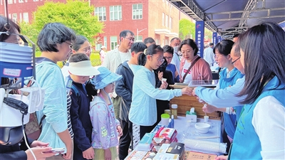 ▲青岛市科技活动周启动仪式现场,市民品尝优质畜产品。