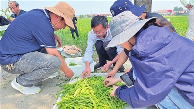▶专家深入基地对青岛市农科院自主选育的鲜食豌豆新品种进行现场测产。