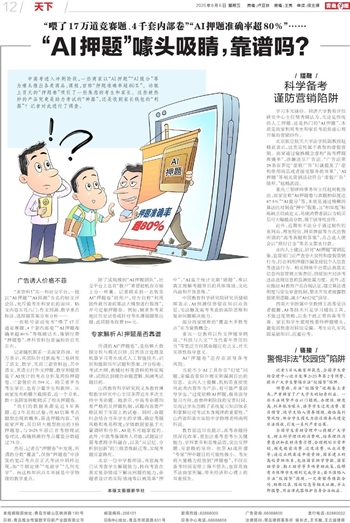 教育部近日也提示,高考命题持续深化改革,更加注重考查考生关键能力、学科素养和思维品质,突出反押题、反套路的导向。依靠AI或所谓“专家”押中题目的可能性极小。考生将大量精力投放到“押题卷”,不仅在备考时间安排上得不偿失,也容易被不法商家所骗,带来经济和心理上的双重损失。