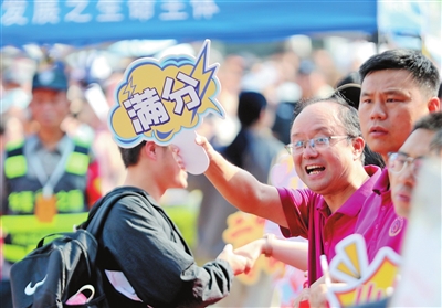 老师拿着满分的牌子为考生加油。青报全媒体/观海新闻记者 韩星 摄