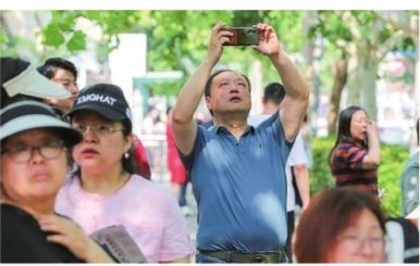 家长用手机记录孩子赴考难忘瞬间。