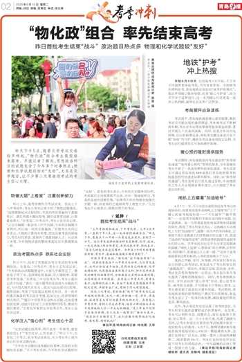 昨天下午5点,随着化学考试交卷铃声响起,“物化政”组合考生提前结束高考。早报记者了解到,思想政治科目的试题包含了今年多个时事热点;物理和化学试题则相对“友好”,尤其是化学题目,让不少第二天要继续考试的考生信心大增。