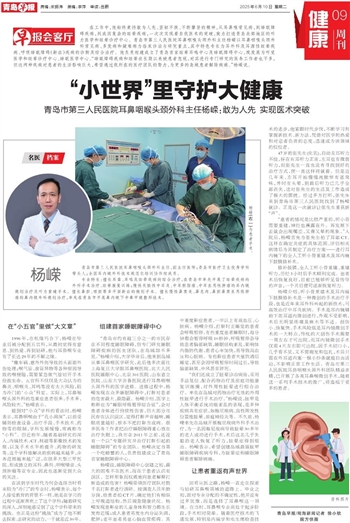 在工作中,他始终秉持敢为人先、坚韧不拔、不断攀登的精神,从耳鼻喉常见病,到睡眠障碍疾病,到成因复杂的眩晕疾病,一次次实现着自我医术的突破,致力打造青岛北部地区的听力医学和眩晕诊疗中心。青岛市第三人民医院耳鼻咽喉头颈外科主任杨嵘以耳鼻咽喉头颈外科常见病、多发病和疑难病为临床诊治与研究重点,其中特色专长为耳外科及耳源性眩晕疾病、呼吸睡眠障碍(鼾症)疾病的诊断及综合治疗。他负责组建成立了青岛首家眩晕耳鸣中心及睡眠障碍中心,现发展为听觉医学和眩晕诊疗中心、睡眠医学中心。“睡眠障碍疾病和眩晕症长期以来被患者忽视,对其进行专门研究的医务工作者也不多,但这两种疾病对患者的生活影响巨大,希望通过我所在的医疗团队的努力,为更多的岛城患者解除病痛。”杨嵘说。