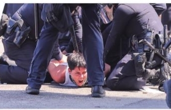 在洛杉矶市中心的联邦执法机构门前,一名抗议者被警察控制。