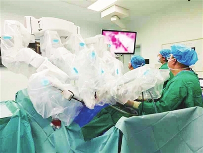医生操控“妙手”四臂手术机器人为患者手术。院方供图