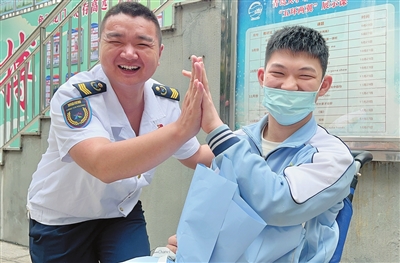 今年中考,小杰迎来了人生中的关键一战。张培生主动揽下接送小杰中考出行的重任,并早早准备好了中考文具套装、加油手幅以及一束鲜花。昨日清晨,张培生轻车熟路地来到小杰家,将小杰抱上车后,又将鲜花和文具套装递给小杰,“小杰,东西都给你备齐了,别紧张,就像平时一样发挥,叔叔相信你!”到达考点后,张培生并没有急着离开,而是展开手幅,高高举起,像家人一样站在送考的人群中,用坚定的眼神和温暖的笑容,向缓缓进入考场的小杰传递着力量。
