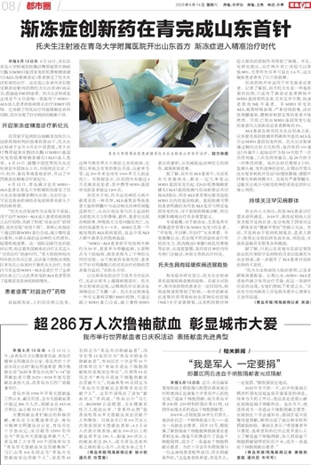 6月12日,青岛确诊患有SOD1-ALS患者在青岛大学附属医院接受了托夫生注射液腰穿鞘内注射,为治疗这一罕见且致命的神经系统疾病带来源头干预的新希望。