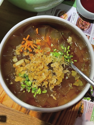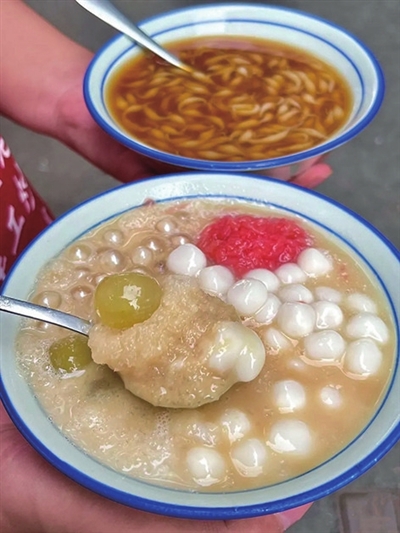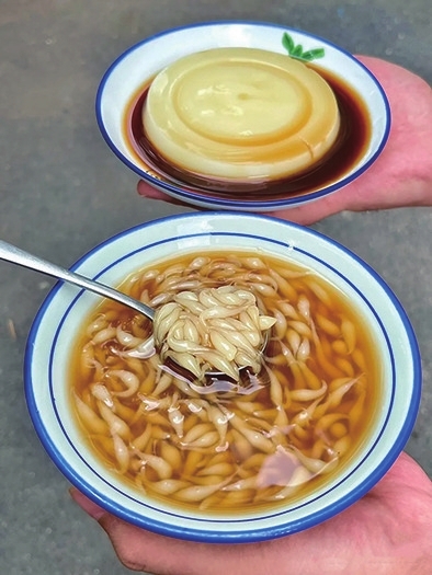 冰粉不是独角戏,在路旁和冰粉一起粉墨登场的,总还有两个伙伴:凉糕—凉虾。两种美味都是用大米浆做的,凉糕是一整块,先用圆形器皿凝固好,然后倒扣装碗,加浓稠的红糖浆。凉虾是米浆凝固时用漏勺漏出来的,细细的一段一段,像虾米,游在红糖水里。“凉虾”真的很像青岛人吃的“虾米”,浸在冰凉的甜水中,也是解暑佳品。来一碗,竟是一种小蝌蚪状的米皮。吃起来不用动牙咬,只需把那些小虾子顺着糖水胡乱往肚里滑吞,就像一碗甜滋滋的冰水,从舌尖清爽到全身。