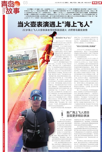 双手提着40多斤重的火壶,火焰温度超800℃……邹信聪在海上边“飞”边舞,表演着非遗代表性项目“火壶技艺”与现代极限运动“海上飞人”相结合的夏日奇景。近日,西海岸新区凭借独特的“西”引力,吸引着来自全国各地的游客。而在这个夏天,西海岸新区的夜晚又多了一抹亮丽的色彩——震撼人心的海上飞人火壶表演每周五至周日准时拉开帷幕。表演者脚踏喷射装置,从海面腾空而起,手中特制的火壶喷射出炽热的火焰,与夜空、海浪交织成一幅绝美画卷。在这场视觉盛宴的背后,有一位年轻而出色的表演者,他就是邹信聪。昨天记者来到西海岸新区海上嘉年华与这位年轻的表演者进行了对话,深入了解这位将“水”与“火”连接到一起的出色的表演者,探寻他在海天之间书写的传奇故事。