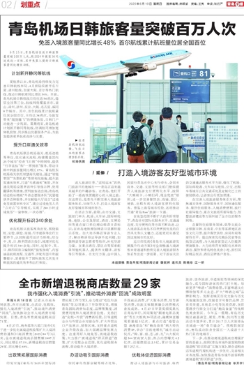 印发实施《青岛市2025年国际消费拓展工作方案》,全力推动“吃住行游购娱”等22项重点工作取得实效,增强青岛国际消费知名度、品牌聚集度、消费便利度和入境消费首位度。支持打造“免税+外贸”消费新场景,引导退税企业与外贸企业对接合作,扩大外贸出口产品展示、销售区域,支持重点退税企业升级改造,加大国潮品牌发展力度。注重用好入境免签、离境退税政策,大力推广离境退税“即买即退”政策,扩大受理企业范围,优化退税服务流程,带动提升入境消费。