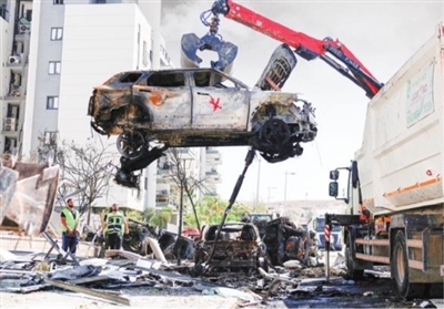 在以色列南部城市贝尔谢巴,工作人员转移遭导弹袭击损毁的车辆。