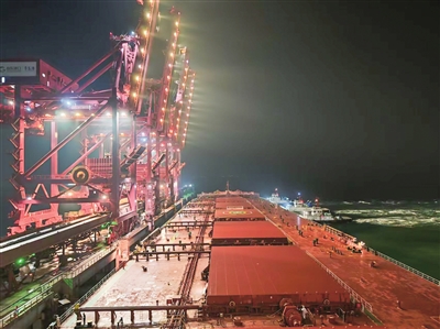 十年间,董家口40万吨矿石码头发生了翻天覆地的变化,码头接卸能力不断攀升,2024年,单泊位年度作业量首次突破4000万吨大关,历史累计突破4亿吨。截至2025年,仅40万吨级大船董家口港区累计接卸超过453艘次。如今,董家口港区建成投入运营各类泊位27个 ,海上航线通达世界180多个国家和地区的700多个港口,已然成为全球航运网络中的重要节点。