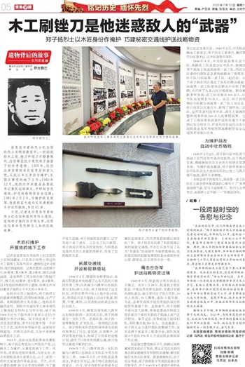 在青岛市革命烈士纪念馆的烈士实物馆藏室中,一把斑驳的木工刷、锉刀和刨刀片静静陈列,这些都是抗日英烈郑子扬留下的珍贵遗物。1935年,这位出身贫寒的木匠在青岛秘密入党,从此以木工身份为掩护,长期从事党的地下工作;1940年12月,他担任中共胶县县委副书记兼民运部部长,开辟秘密交通线,护送战略物资安全过境;1945年2月2日,为掩护战友突围,他在胶县大连沟屯反清剿战斗中壮烈牺牲,年仅41岁。