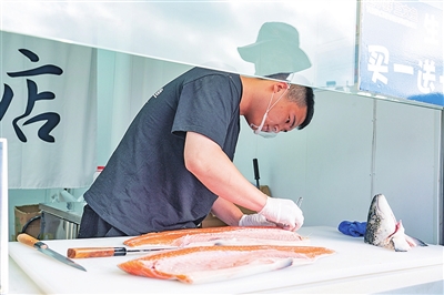 “鱼小鲜三文鱼”主理人曹岩介绍,这是他们首次入驻金沙滩啤酒城,每日供应的三文鱼均通过冷链直送,坚持现开现售,日均能卖出七八条。“我们准备的三文鱼体重均超6公斤,品质和口感都有保障。”曹岩说,为了让更多人品尝美味,他们还推出了10元厚切尝鲜款。