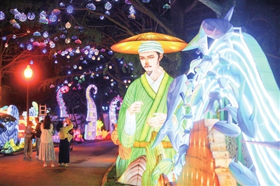 继续向前来到《会前溯光》灯组展区,这里以青岛会前村的历史脉络为叙事主线,通过光影艺术重现村落往昔荣光,瞬间让人打开尘封记忆。古墙的斑驳光影还原了历史遗迹的厚重感,渔民驾舟出海的姿态,无声诉说着会前村的奋斗传奇,彰显出会前村先民踏浪前行的开拓精神;王氏兄弟的人物灯组轮廓线条刚劲有力,搭配动态光影,生动展现他们在时代浪潮中坚守与创新的故事。漫步其间,让人仿若穿越时空,触摸会前村的历史肌理,感受这座城市在岁月淬炼中沉淀的坚韧与温情。“以前不太熟悉会前村的历史,没想到这次逛灯会还能了解古老的渔村文化。看到先辈渔民摇橹出海的光影,突然理解了青岛人骨子里一直有的那股闯劲,这就是城市的厚重文化传承。”市民李女士说道。