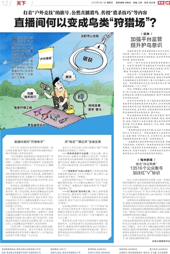 “直播猎鸟以猎杀动物为噱头吸引流量,传播不良价值观,可能吸引一些网民特别是青少年跟风模仿。”鸟类保护专家周海翔建议,一方面加强执法打击、完善平台监管,一方面在社区共治等方面协同发力,提升全社会的爱鸟护鸟意识。