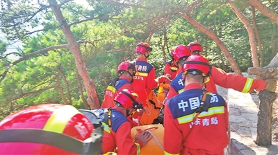 同日下午,崂山北九水景区也传来紧急呼救电话。一名56岁的男游客因大腿抽筋瘫坐在山道上,无法自行下山。“我试着往下走,但腿根本动不了……”电话中,他的声音因痛苦而颤抖。接到求助后,崂山区世园消防救援站迅速派出救援人员,携带多功能担架、急救包等山岳救援装备,立即奔赴现场。