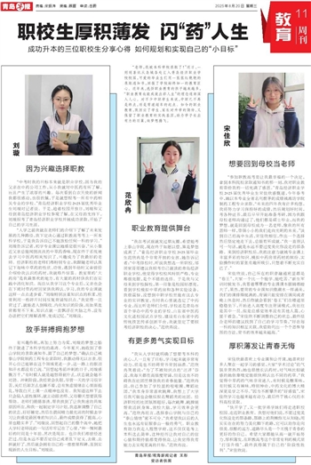 “参加职教高考是让我最幸福的一个决定,拿到本科院校录取通知书的那一刻,我对职业教育带给我的一切充满了感恩。”青岛经济职业学校2025届优秀毕业生宋佳欣感慨道,今年春考中,她以本专业全省名列前茅的成绩被潍坊学院制药工程专业录取,“未来的四年我有许多构想,我将努力学习保持好的成绩,然后规划好时间,考各种证书,最后早早开始准备考研,因为我跟母校老师沟通过了,他们都是硕士毕业,而我的梦想,就是回到母校成为一名老师,像我的所有恩师一样,带领小小的我们走向光明的未来。”谈到自己的高中生活,宋佳欣相信,作出一个选择然后坚定地走下去,总能有所成就。“我一直很认可一句话,就是永远不要过度美化你没走的那条路。来到经济职校后,我的注意力就被专业课上丰富多彩的知识、模拟中药房里药材的缤纷、实验操作时的紧张有趣所吸引,只想着不断充实自己了。”