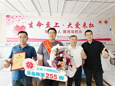 青岛市第255例造血干细胞捐献者王鑫 (左二)完成捐献。