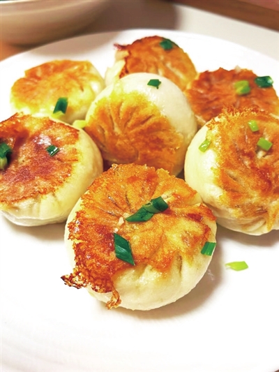 “在我想象中,包包子是件很费功夫的事,但在妈妈那里,早晨一会儿的功夫,一大盘水煎包就能端上桌。”程程回忆,每次她能一睹妈妈做水煎包的过程,都觉得治愈又幸福。水煎包的个头比锅贴大,褶口耷拉地开向一边,馅多皮厚又松软。平底锅中放入少量底油,将包子生坯在锅中排列整齐,那乖巧的模样,如同上课时排排坐、抬起脑袋的认真小朋友,等包子底部煎出硬壳后,倒入水,水的高度不超过包子的一半,这样半煮半蒸。直到发面的包子外皮变胖大,锅中水烧干就可以了。成熟的水煎包因为发面的缘故,会挤在一起。起锅铲动煎包的时候,一颗颗圆滚滚又带着金黄草帽的白胖子排队下落,新鲜出炉,憨态可掬。