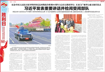 新华社北京9月3日电 铭记伟大历史胜利,凝聚正义和平力量。9月3日上午,纪念中国人民抗日战争暨世界反法西斯战争胜利80周年大会在北京天安门广场隆重举行,以盛大阅兵仪式,同世界人民一道纪念这个伟大的日子,共同开创更加光明的未来。中共中央总书记、国家主席、中央军委主席习近平发表重要讲话并检阅受阅部队。