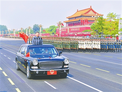 雄壮的军乐声中,习近平乘车沿着宽阔的长安街,依次检阅13个徒步方队、1个战旗方队、22个装备方队。受阅部队军容严整、意气风发,铁甲战车整齐列阵、威风凛凛。这是人民军队奋进建军百年的崭新亮相,这是中华民族捍卫世界和平的坚定宣示。