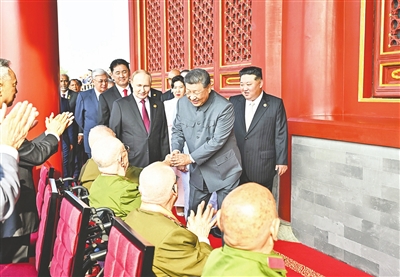 上午8时35分,习近平同出席大会的外方代表团团长拾级而上,登上天安门城楼。习近平同抗战老战士老同志代表亲切握手,向他们表示崇高敬意。