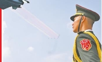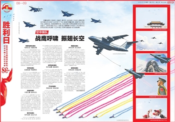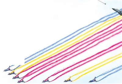 空军八一飞行表演队驾驶歼-10表演机,以超密集编队出场。7架战机在空中划出14道彩烟,寓意着中华民族14年可歌可泣的抗战历程,象征着14亿多中国人民奔向强国复兴的绚丽前景。本版文图据新华社