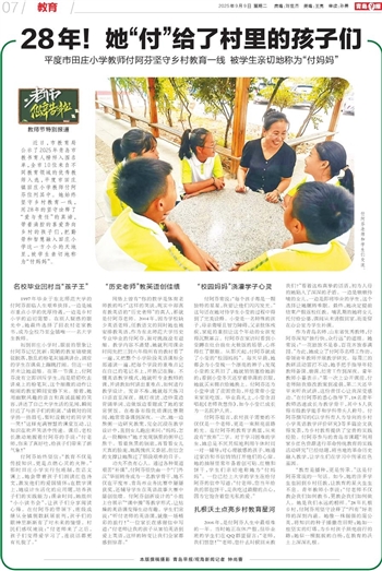 近日,市教育局公示了2025年青岛市教书育人榜样入围名单,全市10位来自不同教育领域的优秀教师入选,平度市田庄镇田庄小学教师付阿芬位列其中。她始终坚守乡村教育一线,用28年的坚守诠释了“爱与责任”的真谛,带着满腔的喜爱奔向乡村的孩子们,把勤劳和智慧融入田庄小学这一方小小的天地里,被学生亲切地称为“付妈妈”。