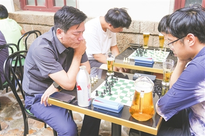9月13日下午,市南区博山路9号,一场特殊的国际象棋大赛正在上演。棋盘上,棋手们凝神沉思,执子搏杀;棋盘旁,啤酒杯碰撞出清脆的声响。这里正在举行的是第十五届国际象棋醉棋王大赛,这场融合智力竞技与啤酒文化的特色赛事已走过15个年头。