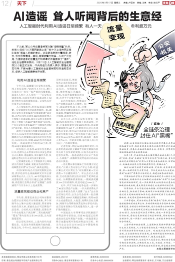 中国社会科学院大学互联网法治研究中心执行主任刘晓春说,新媒体平台应加强对AI造谣和“水军”行为的智能识别机制研究,进一步改革涉及AI内容的流量分发和收益分成机制,最大限度压缩通过AI造谣牟利的空间。