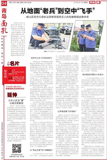在崂山区综合行政执法局有这样一位执法人员,他手握无人机操控器,如同掌控着一双“空中之眼”,穿梭于城区密集楼宇、山地沟壑与沿海滩涂之间,精准捕捉每一处违法建设的蛛丝马迹。他就是杨圣韬,一位拥有着15年执法经验的“老兵”。从最初出于兴趣接触无人机,到如今成为全局无人机应用推广的中坚力量,杨圣韬用科技为传统执法插上翅膀,让违建治理效率实现质的飞跃。
