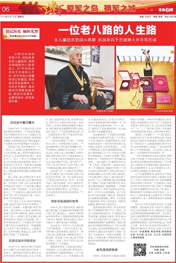 如今,97岁的于忠斌头发花白,不过精神矍铄。回忆起战火纷飞的岁月,他坦言自己从战争硝烟中走来,亲眼见证了祖国从积贫积弱到繁荣富强的过程。在中国人民抗日战争暨世界反法西斯战争胜利80周年之际,于忠斌想对新时代的青年说:“现在国家繁荣富强,人民幸福安康,这一切来之不易。青年们生在改革开放的新时代,要勇当开路先锋,为为党、祖国、为人民多做贡献。”本版撰稿 青岛早报/观海新闻记者 刘文超 实习生 王元洁 市退役军人事务局供图