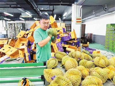 节前榴莲热销,商家在市场档口挑选榴莲。