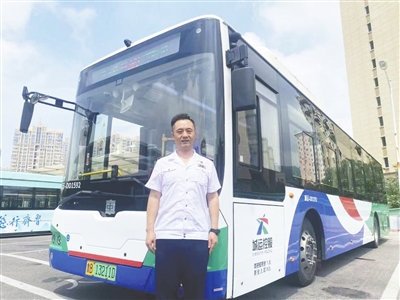 卞涛和他驾驶的公交车合影。