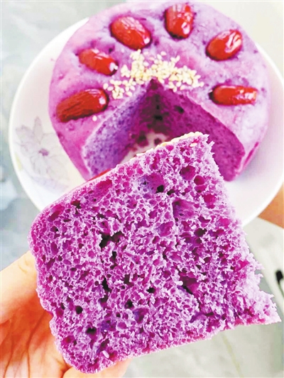 除了蒸、煮、烤,还有做多少都不够吃的紫薯发糕,其口感和紫薯蛋糕不相上下。紫薯的香甜和发糕的软糯融合得刚刚好,不用额外加糖也足够好吃。紫薯蒸熟压成泥,冷却后加入牛奶、鸡蛋、面粉、酵母,搅拌成可以拉丝的糊状,盖上保鲜膜,常温下发酵40分钟。模具中铺烘焙纸防粘,倒入发酵好的面糊,铺上红枣碎。冷水上蒸锅,开中大火蒸25分钟至熟透,关火后焖5分钟就能出锅。