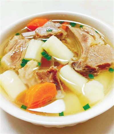 初秋时节,几根排骨切块放入锅内,大火烧开,把山药去皮放入汤内,没有多余的配料,仅用小火慢慢地炖着。一会儿工夫,锅里混合着肉香的汤汁香醇浓厚,山药也被煮得绵密软糯。