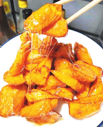 与甘梅地瓜一样,当碳水和油脂的相遇,还变化出了另一种佳肴,拔丝地瓜。选用红瓤或黄瓤地瓜,洗净切滚刀块,入锅焯水后均匀挂上土豆淀粉,待油烧热后把地瓜块倒入其中小火慢炸,至色泽金黄后即可捞出控油待用。而后锅中倒入清水和绵白糖,熬成金黄色后下入炸好的地瓜翻炒均匀,让糖浆紧紧拥抱每一块地瓜即可装盘。在一盘拔丝地瓜面前,“趁热吃”绝对不是一句简单的客套话,用筷子夹起一小块,柔韧的糖丝在阳光的照耀下泛着琥珀色的光,缠缠绵绵,依依不舍。拔丝地瓜与甘梅地瓜的酸甜口感不同,糖浆极致的甜蜜瞬间占领了口腔。若是把地瓜块儿往清水里轻轻一蘸,冷热交替,脆脆的糖壳旋即形成,口感则更富有层次变化,焦脆恰到好处,软糯恰如其分,浓香经久不散,让人每吃一口都有惊喜。