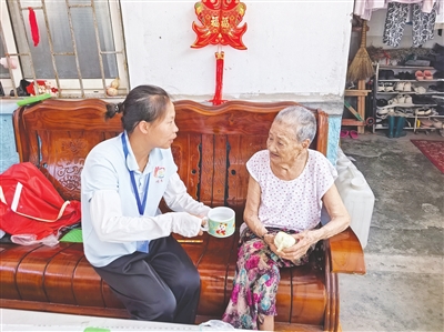 蓝帅帅(左)给独自在家的老人送去午饭。