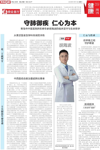 近年来,随着疾病谱的变化和人民群众对健康需求的提升,胡海波所在的科室及团队共同推动了学科的跨越式发展。科室病床数从最初的50多张,逐步扩至如今的200多张。“病床数量的增加,不仅仅是物理空间的扩展,更意味着救治能力的提升、诊疗技术的革新和学科地位的确立。”胡海波介绍,如今,科室配备了全套高端有创/无创呼吸机、血液净化设备、电子支气管镜、内科胸腔镜、高级生命检测系统等先进设备,能够独立开展高水平呼吸支持、呼吸内镜下介入等复杂诊疗技术。这支团队,已经成为青岛地区应对呼吸道重大公共卫生事件和救治危重症患者的中坚力量。