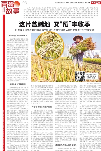 金秋十月,稻浪滚滚。昨天是第45个世界粮食日,“不让任何人掉队:更好生产、更好营养、更好环境、更好生活”的主题,在青岛海水稻研究发展中心的试验基地里有了最生动的注脚——青岛海水稻研究发展中心试验田耐盐碱水稻(海水稻)迎来丰收,金黄稻穗压弯枝头,勾勒出一幅盐碱地变良田的喜人图景。青岛早报记者现场探访获悉,自2012年袁隆平青岛海水稻团队成立以来,便锚定“向盐碱地要耕地、向海洋要粮食”的目标,系统开展海水稻种质资源的收集、鉴定与创新利用。团队累计收集上千份海水稻种质资源,成功搭建起全球领先的海水稻遗传育种平台,最终将海水稻从实验室推向规模化种植的广阔天地,为我国乃至全球粮食安全筑牢了坚实的科技根基。