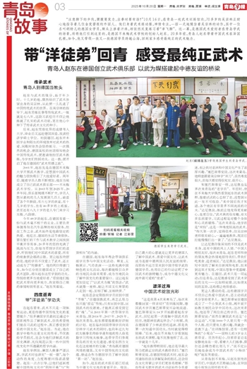 赵东还会定期组织学员回到中国“寻根”,“在德国教武术,再怎么努力也只能‘接近’传统;只有回到中国,回到武术的发源地,才能真正感受到它的‘魂’。”从2011年第一次带领学员来青岛,到2014年、2017年、2025年,每次来青岛,赵东都要提前做好详细的计划。赵东每次回国带领学员向吴宗林学习武术的同时,也向年过九旬的太极拳名师薛举进和他的传人薛美勤学习传统太极拳,还带学员们参观青岛的历史文化遗迹,感受东西方文化在这座城市的交融。“青岛既有德国风情的建筑,又有中国传统的文化底蕴,很适合作为德国学员了解中国的‘第一站’。”赵东说。