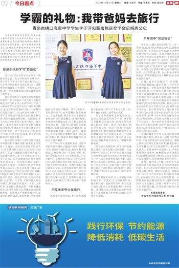 今年春节和国庆节假期,青岛古镇口海军中学初三女生李子洋和初一女生裴寓帆拿出自己获得的奖学金,带着自己的父母出门旅游。在日前的教学分享会上,这两位品学兼优的学生不但介绍了自己的学习秘籍,她们还自豪地说:“我带爸妈去旅行,钱是我出的!以前都是爸妈带我们旅行,现在我可以用自己获得的奖学金带他们旅行了。”