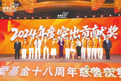 慈善事业的良好发展,离不开社会各界爱心人士的无私之心、慷慨之举,庆典现场,爱基金颁发了“2024年度突出贡献奖”,奖项表彰2024年度在爱基金捐款、拍卖贡献最大的14位爱心朋友,以此来表达全体爱基金人深深的感恩与崇敬之情,这14位获奖者每一位的捐款金额都超过了10万元!