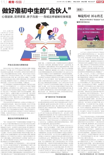 近日,岛城多所小学举行以“小初衔接”为主题的家长会或开放日活动,为家长、学校和专家搭建了一个高效的交流平台。通过专家引领、经验分享和课堂互动,家长们对小初衔接有了更清晰的认识,也掌握了更多科学的教育方法。