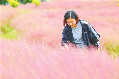 市民在浮山森林公园粉黛乱子草丛中拍照。青岛早报/观海新闻记者 魏铌邦 摄