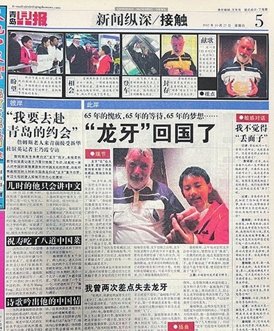 离开青岛65年后,2002年,一直为偷走“龙牙”感到愧疚的詹姆斯决定回到青岛,归还“龙牙”。临行前,他给青岛早报编辑部写来了一封“自省书”:“童年好友沦落魔掌的事情发生在20世纪30年代末,我作为英国公民而享有的权利使我的安全得到了保障。不过,偷龙牙一事在此后60多年的岁月里成了我生活的一块阴影。”早报不仅报道了他的故事,还协助他完成心愿,促成他专程来青归还“龙牙”,并陪同他参与央视节目《聊天》的录制,让这段往事得以圆满落幕。