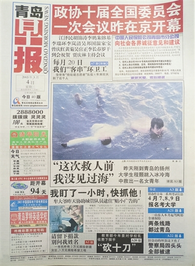2003年3月3日,来青做企业调查的程颢在五四广场附近游览时,突遇一个打工妹跳海轻生,他不顾零下10℃的水温,毅然下海救人。青岛早报独家报道后,程颢受到各界赞扬。市有关领导作出批示,号召全市人民向程颢学习。