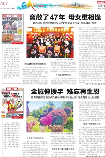 黄蓉寻亲的故事当年在青岛早报连续报道,引发市民广泛关注。从10月17日黄蓉开始寻亲,到11月10日DNA确认母女关系,短短25天内实现的这场团圆,创造了青岛寻亲故事的一个奇迹。