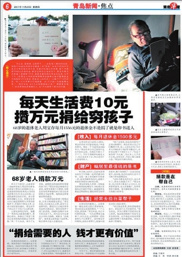 “他用微弱的火苗点燃朴素的信念,照亮了寒门学子前行的道路。他赋予金钱特殊的意义,让微薄的收入呈现出最大的价值。岁月使一个人的身体渐渐老去,但仁者的责任,却让他精神蓬勃常青。”这是 2011年“感动青岛”给周宝存的颁奖词。2011年,青岛早报独家报道了周宝存“裸捐”的故事。他平时省吃俭用,每天吃饭仅花费10块到15块钱,却每年都会把自己积攒了一年的所有积蓄拿出来,捐给困难学生。2022年春天,这位八旬老人悄悄离我们而去。